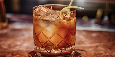 0.25 oz. Agave Syrup, Large Ice Cube, Orange Zest, Luxardo maraschino cherry